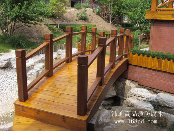 在过去木桥是所有桥梁的主要形式,由于木材取得容易而且易于安装,所以早起的桥梁基本上都是用木材建造。然后到了现代,随着科技的进步发展,越来越多的材料取代了木材,成为了建造桥梁的主要用材。但这并不影响木材的使用,在一些度假村和景点就经常建造木桥搭配景致。现代木桥都采用防腐木,因为防腐木建造的木桥在户外使用时不会开裂变形、不会腐蚀,所以可以有效的提高木桥的使用寿命。常用的做木桥的防腐木材有樟子松,南方松,芬兰木等。上图是芬兰木制作的防腐木木桥,他的特点是不仅防腐、防霉结构稳定而且外形美观大气。