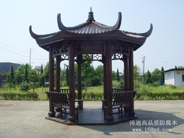 炭化木凉亭的主要材料是使用炭化木。碳化木是将木材经过表面高温处理,使用焊枪等火焰烧木材表面,使其表面产生一层很薄的炭化层,这样就可以从外面对木材产生保护,从而达到保护木材的作用。同样属于户外木材,炭化木与防腐木有着本质的差别。一般的防腐木材,都要经过防腐剂的注入过程,这样的木材是由化学方式使木材具有防腐性。而炭化木则是不同的,它主要是靠表面的加温,使其炭化改变木材的分子结构和物理性能而达到防腐的目的。