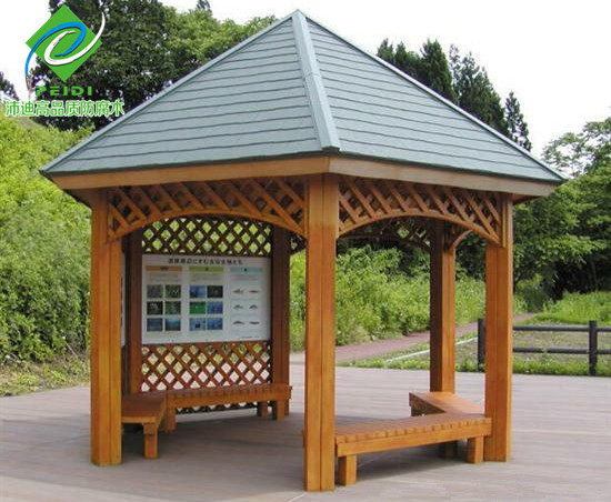 当然现在也有其他材料制作凉亭的,如市场、铁艺、水泥、塑木和炭化木等。这些材料都各有所长,但是也有明显的不足,在某些方面总会有一些不如人意的地方。对于防腐木凉亭这样的问题就不存在,首先木材是纯天然的材料,而园林景观也是户外景观花草树木,木材正好和这些自然景观有机的融合在一起;而且,防腐木材使用木材是天然环保的,对人体健康和环境影响较小;防腐木凉亭的造型一般都别具匠心,让人看着就觉得舒服,在里面休闲也很不错,从舒适的体验上来说防腐木凉亭也是最好的。