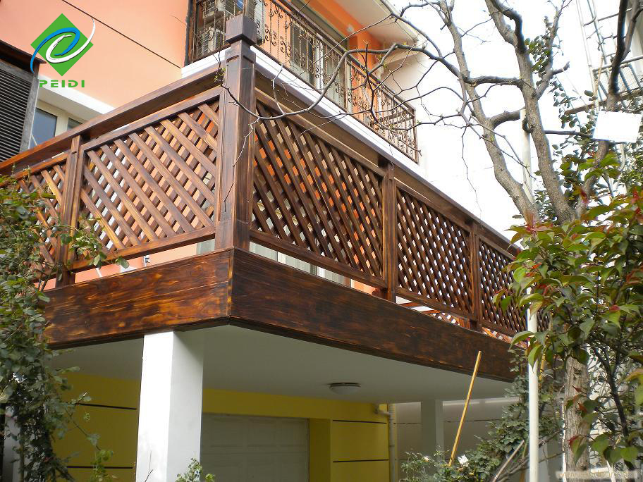 防腐木栏杆即是用防腐木做成的栏杆。从形式上看,栏杆可分为节间式与连续式两种。前者由立柱,扶手及横挡组成,扶手支撑于立柱上;后者具有连续的扶手,由扶手,栏杆柱及底座组成。常用于各种景观建设,临水、高空保护,使我们能够放心畅游的同时,其本身也构成了精致的景致!防腐木栏杆结构多样,材质富于变化,常见的有南方松、樟子松、菠萝格等,防腐木材质使其拥有更加长久的寿命。